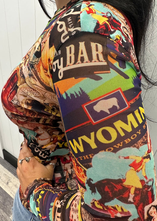 COLLAGE WESTERN LONG SLEEVE MESH TOP